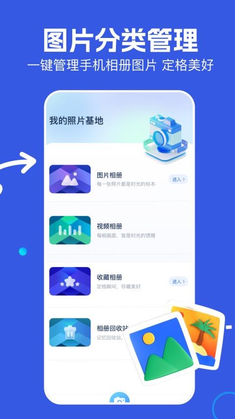 理理相册app可以让你一键拍摄不同的图片来进行保存,里面能够提供专业的相机可以让你轻松进行拍摄,同时也可以为你提供修图功能来轻松修理不同的图片,让你可以轻松创作个性化作品;还可以利用不同的相册来对图片进行保存,这样你也可以轻松整理更多图片!