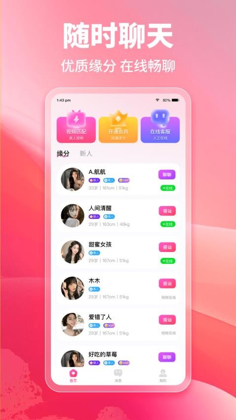 能够与异性对所有感兴趣的话题内容在线沟通,用户可以更加自由的进行交谈聊天;