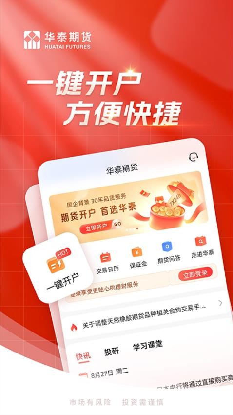 华泰期货投资交易软件非常的专业,可以对股指期货、期权以及热门品种的期货产品全面投资,能够顺利完成所有的投资操作;并且还有期货相关的众多服务功能,为用户带来了一站式的期货服务;丰富的期货资讯以及投研报告为用户带来更多准确的参考信息,一手掌握多维度的投资信息。