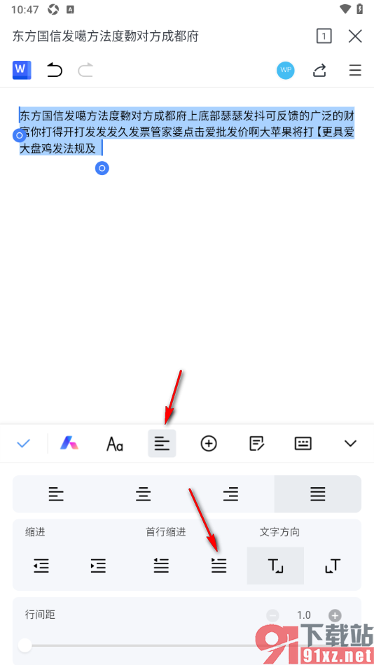 1.在手机上将WPS点击打开,然后进入到文档编辑页面中,将我们需要设置的文字内容框选起来,点击右下角的箭头图标。