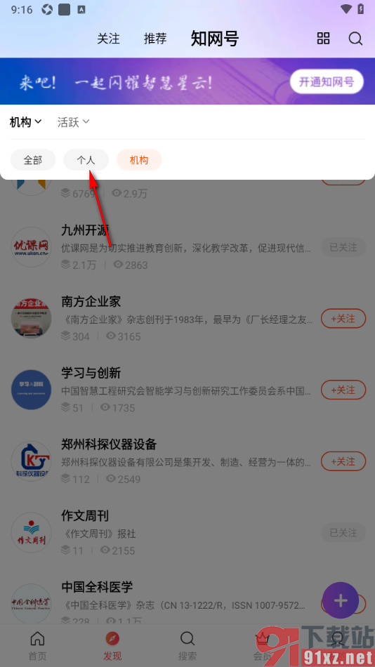 2.这时候,我们就可以在打开的页面上方的位置找到【知网号】选项,将其点击打开即可查看到页面下方展示出来的一些活跃状态不错的机构。