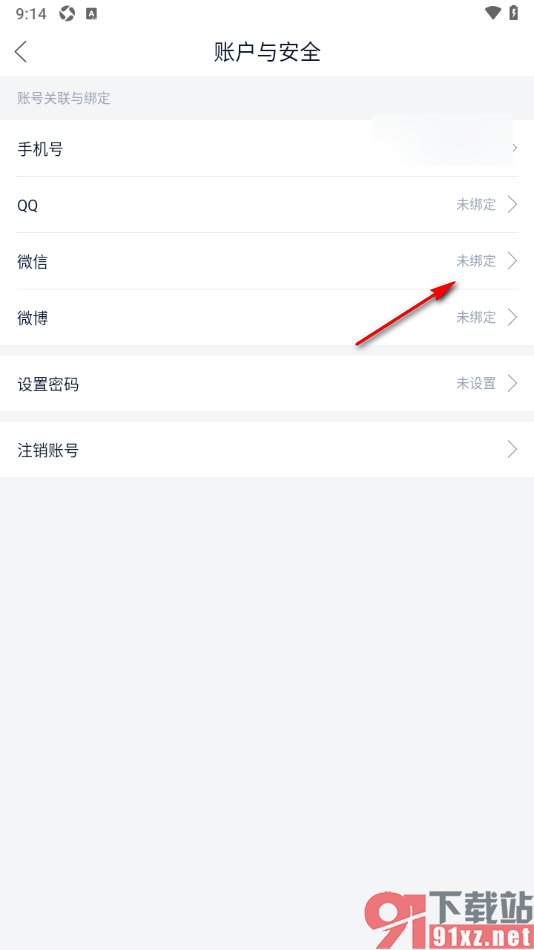 4.这时候进入到打开的页面上就可以点击【微信】后面的【未绑定】选项点击一下即可跳转到微信中授权绑定。