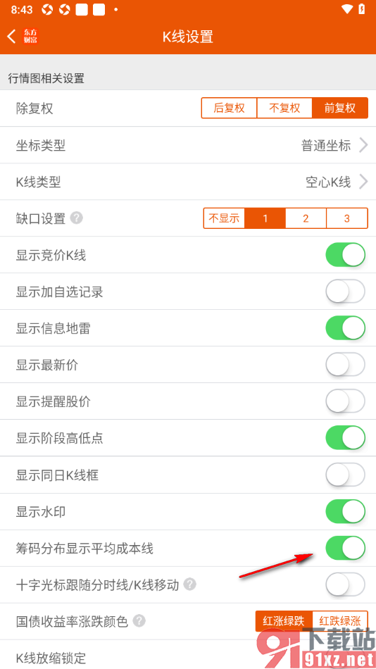 4.在打开的页面上即可查看到显示的【筹码分布显示平均成本线】选项,将其开关按钮点击开启即可。